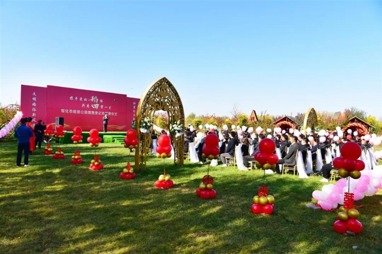 11日,在稻穗飘香、满载收获的季节里,绥化市首家公园式婚姻登记处——稻田公园婚姻登记处正式揭牌。