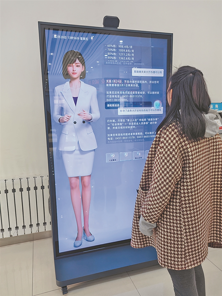 生活报讯 (记者张立 文/摄) 2月28日,在哈市平房区政务服务中心,一位特殊的“工作人员”吸引了众多办事群众的目光,她就是省内首个智能AI政务业务咨询互动交流虚拟数字人“平平”。