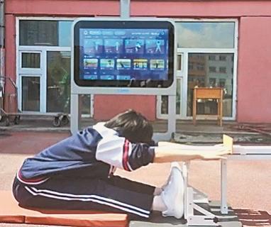 在操场上,智慧大屏最为招人,上面有多个智能模块,包括热身运动、拉身运动、开合跳、跳绳……还有中考考试项目视频,同学们跟着大屏幕一起进行开合跳,大屏幕上不仅显示了每个人一分钟跳的数量,还给出了排名。九年级学生小丽告诉记者:“我从前跳绳或者开合跳都兴致不高,但现在知道一分钟跳多少了,就有了兴趣,大家还一起比着跳,看谁跳得多,在玩儿的同时,还锻炼了身体,重点是对明年的中考有帮助。而且有运动回放功能,能知道自己的动作是否标准。”