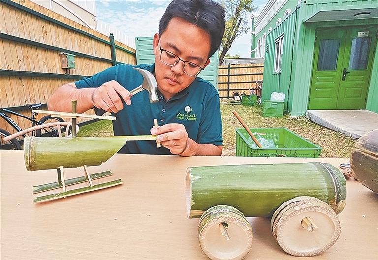 有几名工作人员正在制作竹制玩具,只见他们将竹筒和竹片组装成小汽车和小飞机的形状,还在机身预留缝隙,方便藏入水果块,让大熊猫在推动和拆解的过程中获取食物。另一组人则用竹子搭成一张小桌子,供熊猫啃咬。