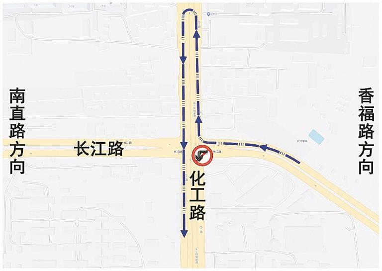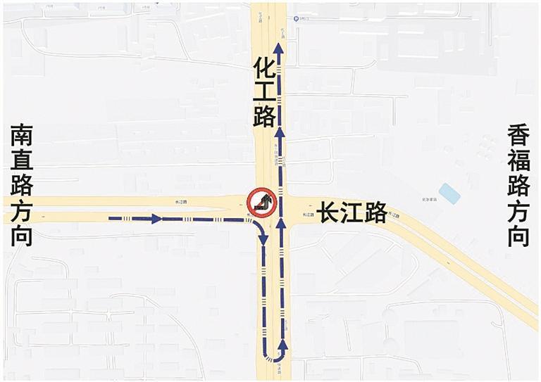 具体措施为:禁止长江路双向车辆左转进入化工路。原先需要左转的车辆,需调整为“右转—直行—掉头”的U型回转方式通行,即车辆在路口右转进入化工路后,直行至最近的可掉头信号灯路口完成转向。