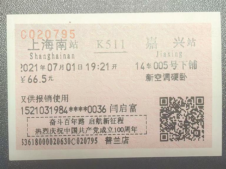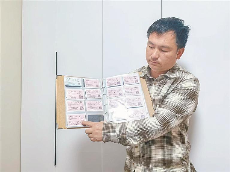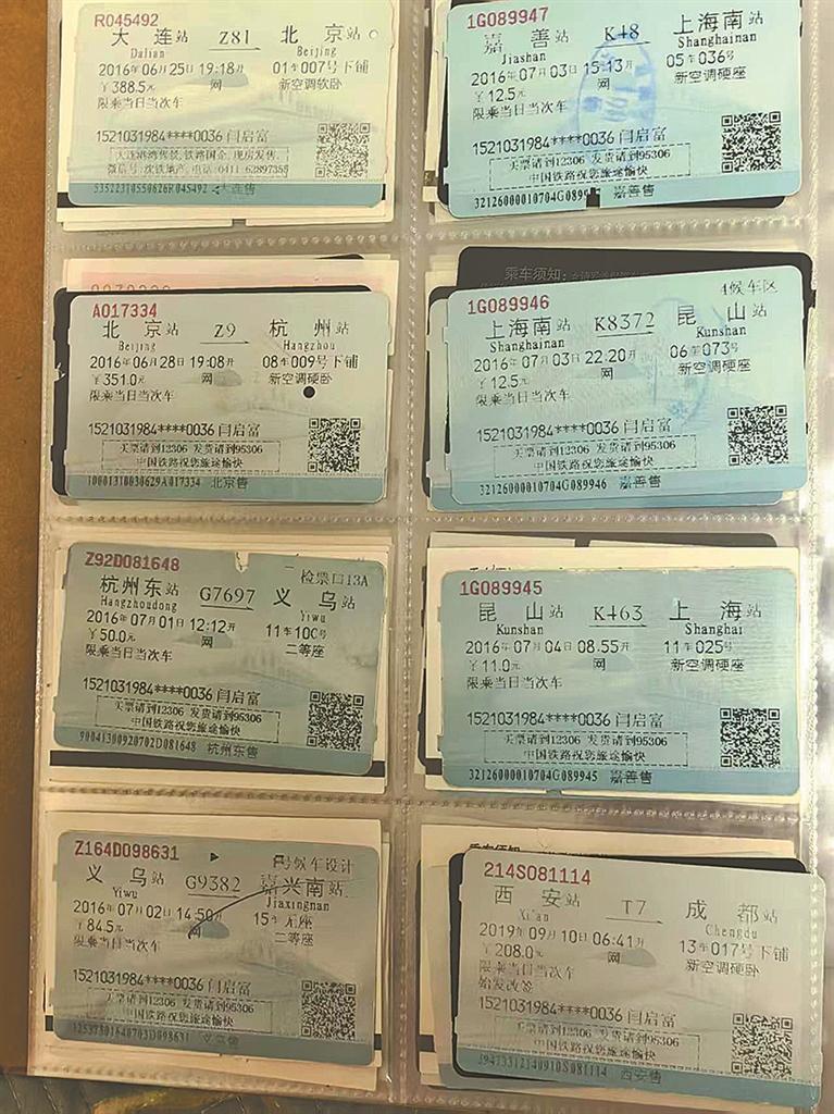 从小在扎兰屯火车站铁路边长大的80后铁路爱好者闫启富,很喜欢探寻火车票背后的故事:“有一些火车的车次数字、车票日期,对于购买者可能都有特别的意义,可能是生日,也可能是特别纪念日。”记者看到,闫启富的收藏包含他最爱的2084升级K字头前最后一趟车和升级K字头后第一趟车的车票;纸质报销凭证停用前最后一趟车(2025年9月30日23:59,绥化—哈尔滨东)的纸质报销凭证;也有庆祝建党100周年的2021年7月1日19:21上海南—嘉兴的火车票……“当我知道纸质票取消后,多少有些怅然若失。”闫启富感叹道。