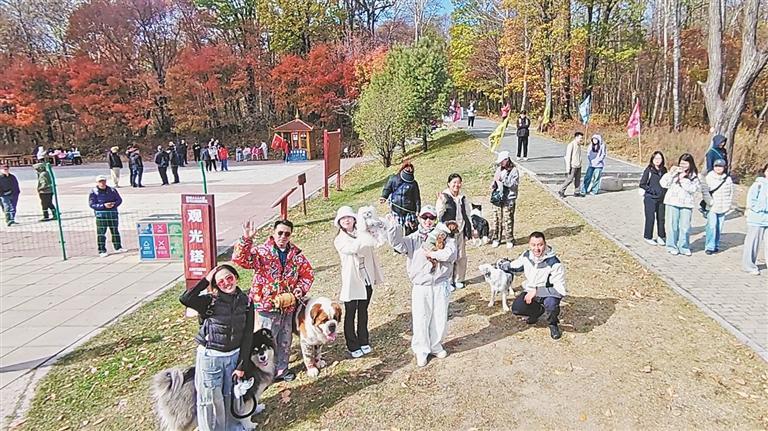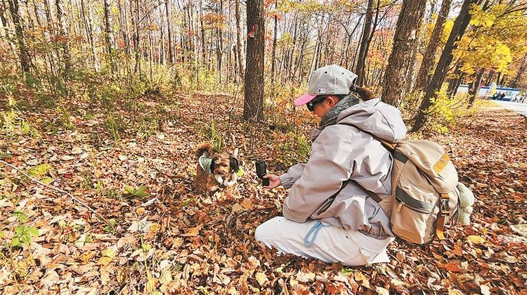 在金龙山风景区划定的宠物友好登山区域,大大小小的狗狗们在主人的牵引下,兴奋地探索着这个新奇的自然世界。一只名叫“六一”的阿拉斯加犬正欢快地在落叶堆里打滚,一只小巧的泰迪犬与同伴嬉戏打闹,铃铛声清脆悦耳。