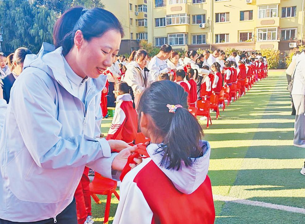 当日14时30分许,记者在现场看到,伴随着《出旗曲》雄壮激昂的旋律,3名身着整齐校服、佩戴红领巾的旗手出少先队旗。家长们提前将红领巾叠放整齐,双手托举走到孩子面前,小心翼翼地展开红领巾。有的家长先轻轻抚平孩子的衣领,再将红领巾绕过孩子脖颈,认真地打了一个工整的结;有的家长在系红领巾时,还会在孩子耳边轻声叮嘱几句。系好红领巾后,家长们将手写信递到孩子手中。安诗文的家长在信中写道:“入队不是终点,而是你成长的新起点,不管遇到什么事情,爸妈永远是你坚实的后盾,期待更优秀的你。”陈美汝同学也在信中告诉家长:“亲爱的爸爸妈妈,这不仅是一份荣誉,更是一份责任。请您们放心,戴上红领巾的我,会像小树苗渴望阳光一样,努力学习、团结同学,用行动证明自己配得上这份光荣!”