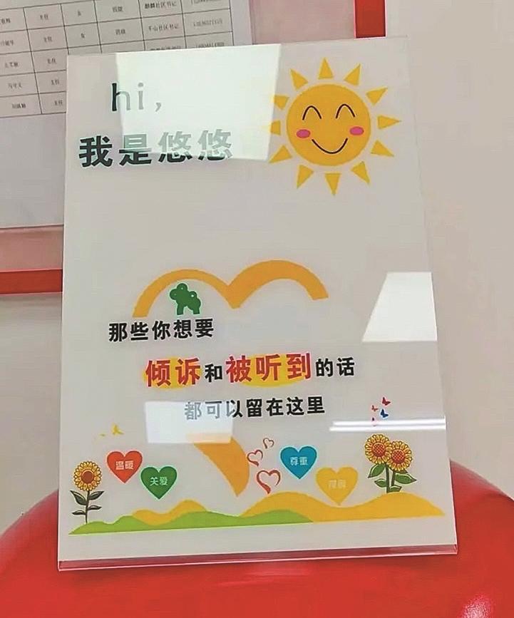 走进新春街道悦山国际社区服务中心大厅,一个红色的邮筒格外引人注目。邮筒周身装饰着象征希望的小黄花,顶部的指示牌上写着“hi,我是悠悠”,亲切的问候语瞬间拉近了与居民的距离,削弱了传统心理服务的正式感和距离感。
