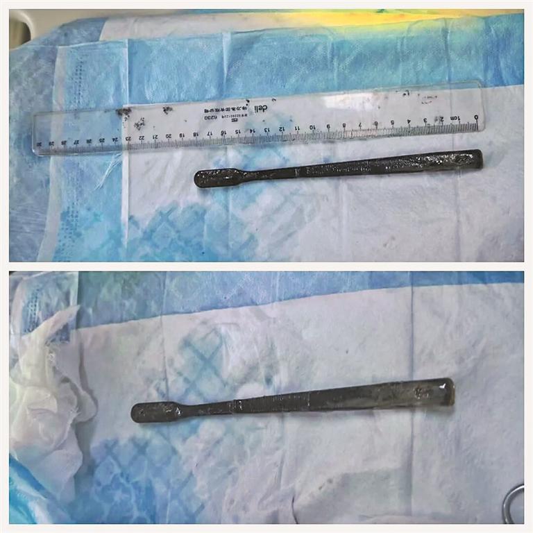 记者了解到,今年50多岁的张先生多年来胃里总是隐隐作痛,但他一直没当回事,也没有进行过系统检查。随着年龄的增长,近两年胃疼越来越频繁,于是他来到大庆龙南医院就诊。经了解,张先生在1998年吞过牙刷,当时没太在意……这一“没在意”竟让隐患在他胃里“潜伏”了27年。面对这一罕见情况,大庆龙南医院消化内科医生黄波迅速组织团队进行详细评估,联合麻醉手术科副主任王寒冰共同分析研判,从异物位置、胃腔环境到器械选择再到麻醉方案,团队反复推演,只为制定更加安全的手术方案。经过一系列检查和术前准备,10月27日为张先生进行了手术,徐涛医生成功为其取出一把牙刷,本以为手术结束了,然而令人意外的是,影像资料显示,其胃里还有另一把牙刷!