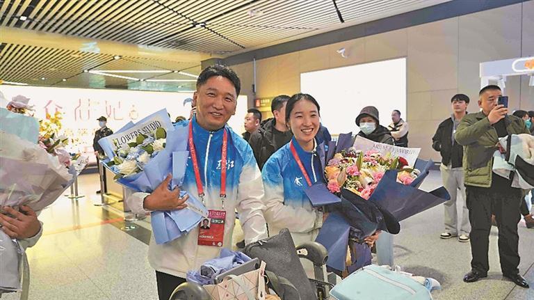 生活报讯 (记者张立) 11月22日晚,参加第十五届全运会的黑龙江代表团返回哈尔滨。省体育局及相关直属单位代表亲赴机场迎接,热烈欢迎代表团载誉而归。