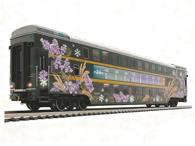 在街区内设计的另一处“幸福列车”温度计目前正在施工中,此处设计深入挖掘“哈尔滨是火车拉来的城市”这一历史脉络,提取冰晶蓝、丁香紫、兴安绿、丰登黄四种象征哈尔滨自然与丰收的专属色彩,将透明LED屏、柔性随贴屏嵌入现有火车车厢造型中,并巧妙融入雪花、丁香花等本地元素。结合蓝牙及App智能控制系统,这座温度计科技感十足,更以动态视觉呈现城市四季流转中的温暖烟火气,成为连接过去与现在的时空载体。